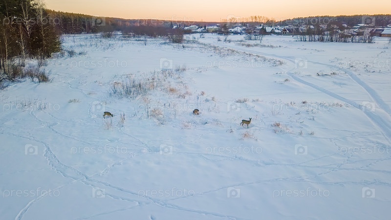 На озере пасутся дикие косули. Рядом с деревней. Время заката Зимняя ясная погода, От дрона