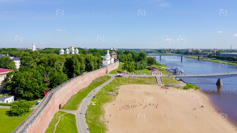 Великий Новгород, Россия. Новгородский Кремль (Детинец), река Волхов. Полет над городом, С дрона