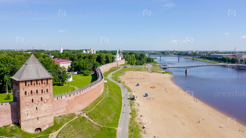 Великий Новгород, Россия. Новгородский Кремль (Детинец), река Волхов. Полет над городом, С дрона