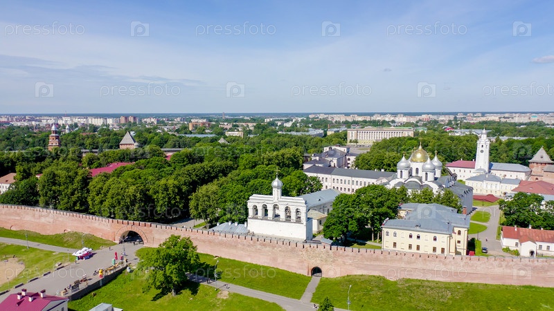 Великий Новгород, Россия. Новгородский Кремль (Детинец), река Волхов. Полет над городом, С дрона