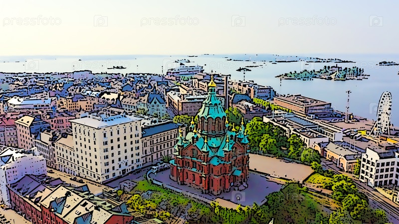 Хельсинки, Финляндия. вид с воздуха на центр города. Успенский собор. Яркая иллюстрация в мультяшном стиле. С высоты птичьего полета