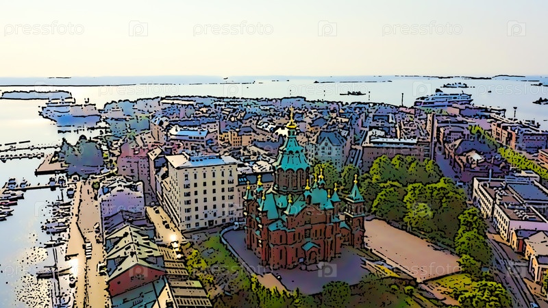 Хельсинки, Финляндия. вид с воздуха на центр города. Успенский собор. Яркая иллюстрация в мультяшном стиле. С высоты птичьего полета