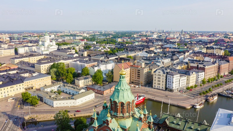 Хельсинки, Финляндия. Вид с воздуха на центр города. Успенский собор, с дрона