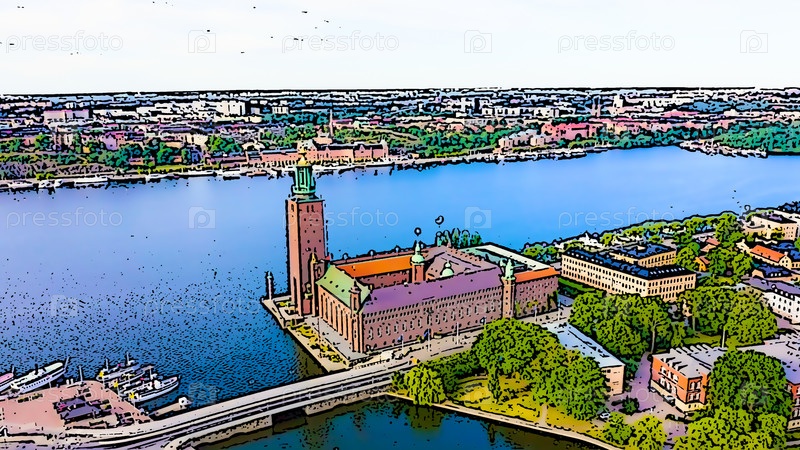 Стокгольм, Швеция. Стокгольмская ратуша. Яркая иллюстрация в мультяшном стиле. С высоты птичьего полета