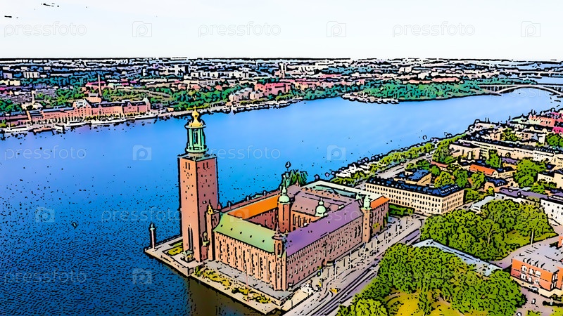 Стокгольм, Швеция. Стокгольмская ратуша. Яркая иллюстрация в мультяшном стиле. С высоты птичьего полета