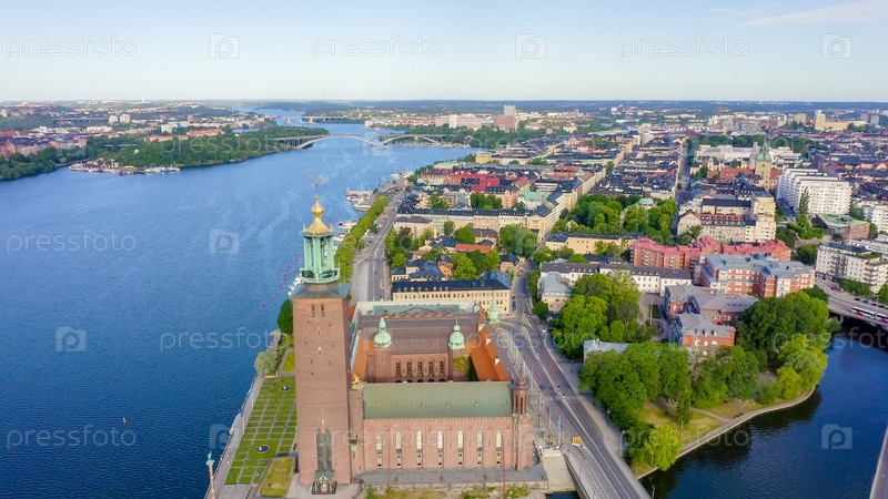 Стокгольм, Швеция. Стокгольмская ратуша. Стокгольмский стадшус. Построен в 1923 году, ратуша из красного кирпича, From Drone