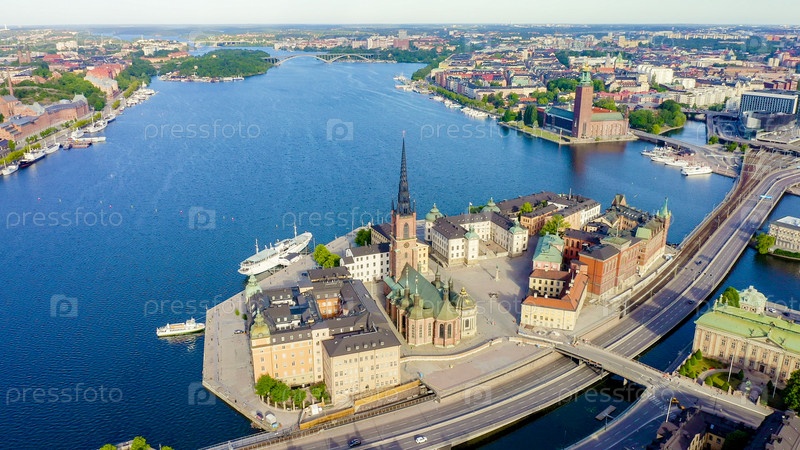 Стокгольм, Швеция. Старый город - Гамла Стан. Риддархольмен. Хельгеандсхольмен. Вид с воздуха, с дрона