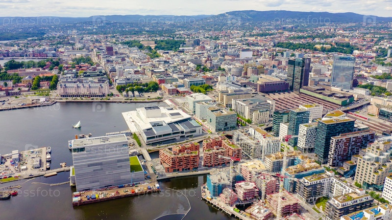 Осло, Норвегия. Центр города с воздуха. Набережная Осло-фьорда. Оперный театр Осло, с дрона
