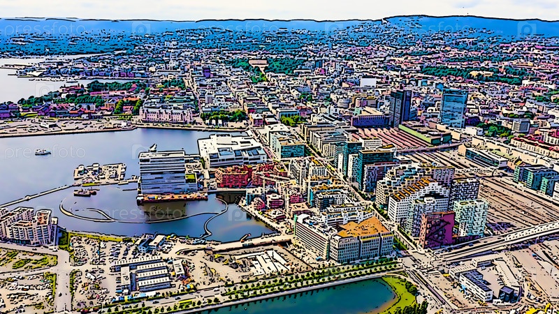 Осло, Норвегия. Центр города с воздуха. Набережная Осло-фьорда. Яркая иллюстрация в мультяшном стиле. С высоты птичьего полета