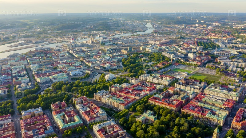 Гетеборг, Швеция. Панорама города и реки Гоэта Эльв. Исторический центр города. Закат, С Дрона