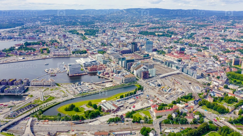 Осло, Норвегия. Центр города с воздуха. Набережная Осло-фьорда. Оперный театр Осло, с дрона