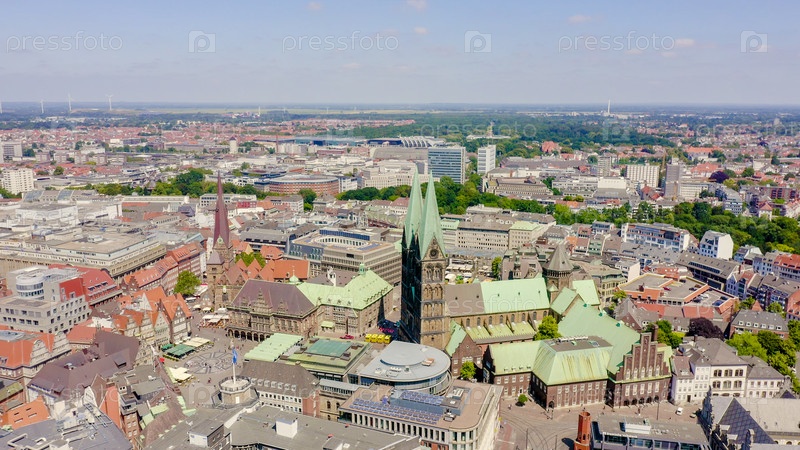 Бремен, Германия. Историческая часть Бремена, старый город. Бременский собор (Св. Петри, Бремен). Вид в полете, вид с воздуха