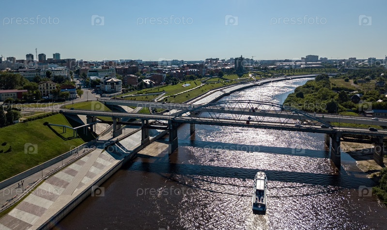 Прогулочный теплоход заходит под автомобильный мост Челюскинцев. Россия, Тюмень. по русскому тексту - ТЮМЕНЬ. Аэрофотосъемка