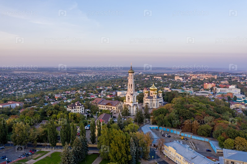 Ставрополь, Россия. Собор Казанской иконы Божией Матери. Вид с воздуха во время заката. Падать