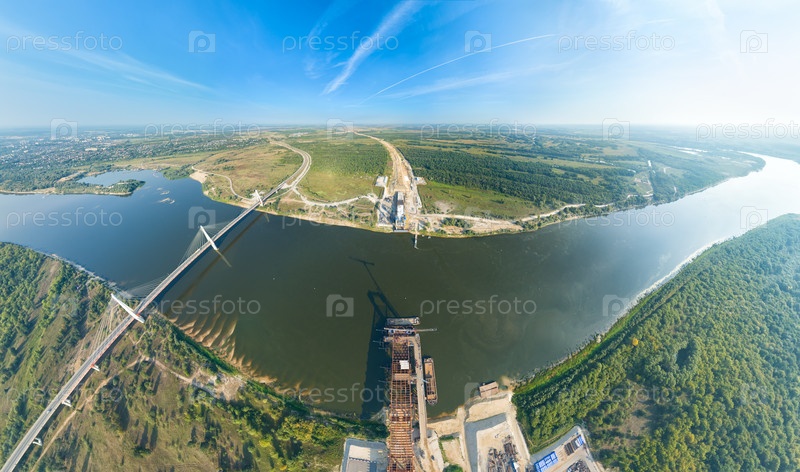 Муром, Россия. Муромский мост. Строительство моста через реку Оку. Строительная площадка трассы М12 Москва - Казань. С высоты птичьего полета