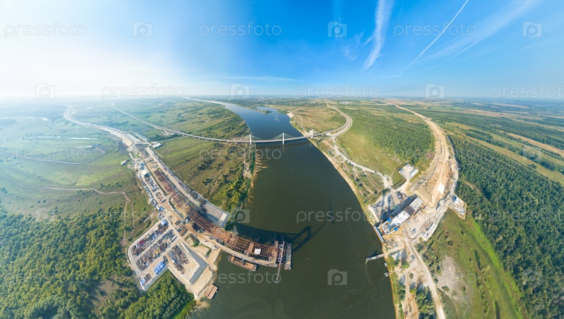 Муром, Россия. Муромский мост. Строительство моста через реку Оку. Строительная площадка трассы М12 Москва - Казань. С высоты птичьего полета