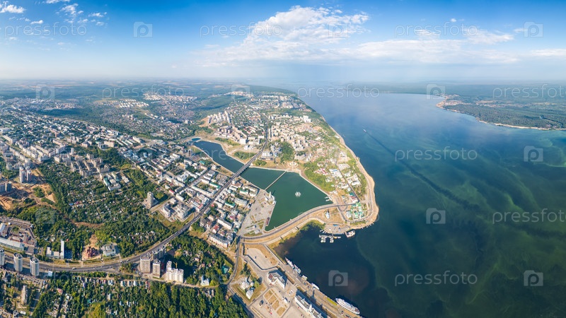 Чебоксары, Россия. Панорама города с воздуха. Чебоксарский залив. река Волга. Солнечный день. С высоты птичьего полета