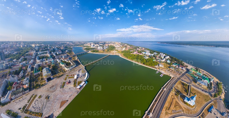 Чебоксары, Россия. Панорама города с воздуха. Чебоксарский залив. река Волга. Солнечный день. С высоты птичьего полета
