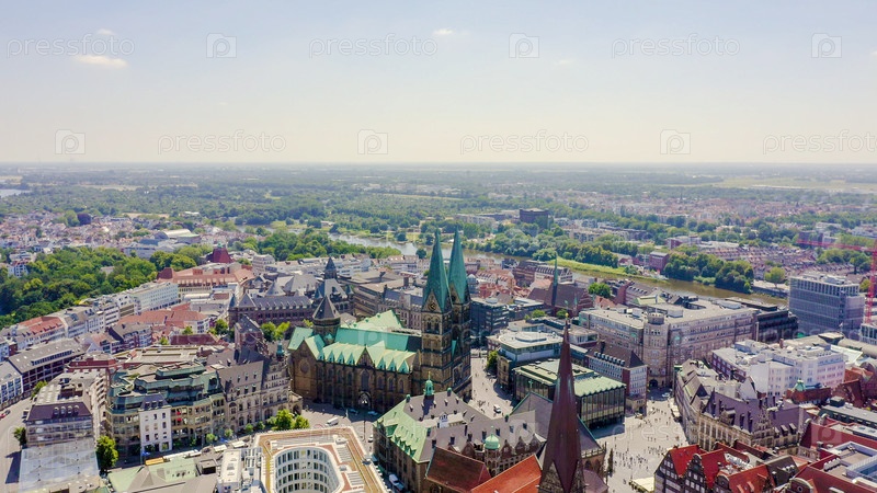 Бремен, Германия. Историческая часть Бремена, старый город. Бременский собор (Св. Петри, Бремен). Вид в полете, вид с воздуха
