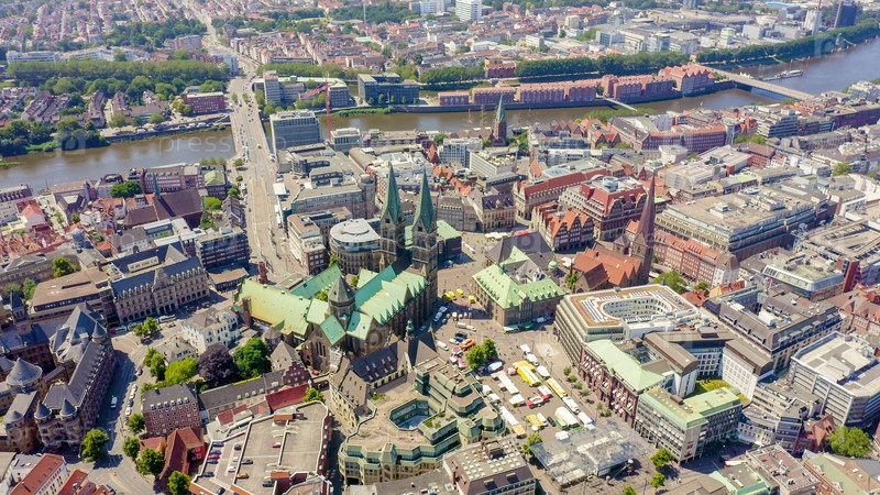 Бремен, Германия. Историческая часть Бремена, старый город. Бременский собор (Св. Петри, Бремен). Вид в полете, вид с воздуха