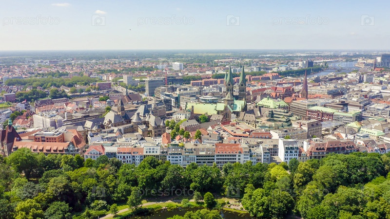 Бремен, Германия. Историческая часть Бремена, старый город. Бременский собор (Св. Петри, Бремен). Вид в полете, вид с воздуха