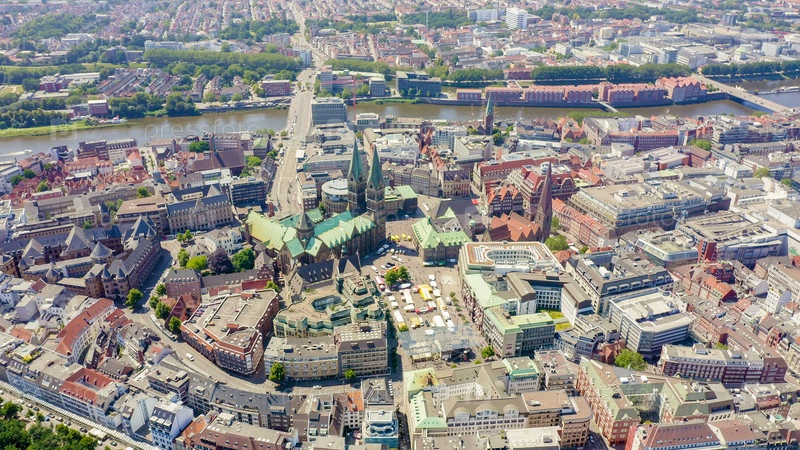 Бремен, Германия. Историческая часть Бремена, старый город. Бременский собор (Св. Петри, Бремен). Вид в полете, вид с воздуха
