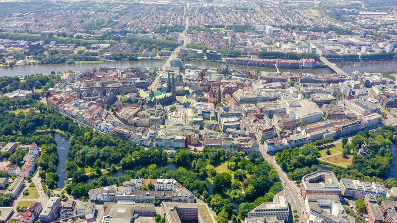 Бремен, Германия. Историческая часть Бремена, старый город. Бременский собор (Св. Петри, Бремен). Вид в полете, вид с воздуха