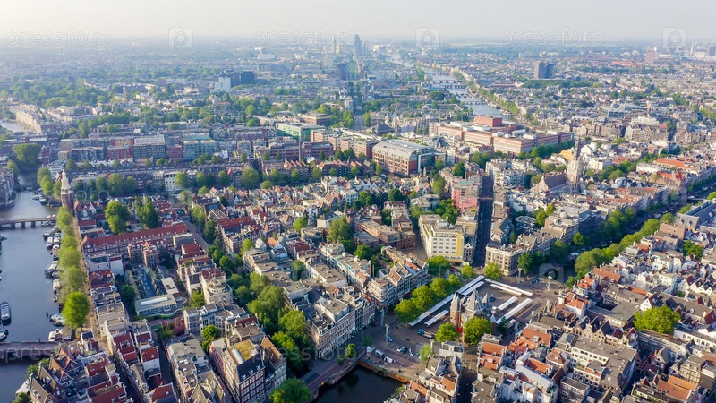 Амстердам, Нидерланды. пролетая над крышами города в направлении Центрального вокзала Амстердама (Amsterdam Centraal), вид с воздуха