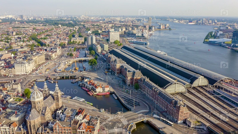 Амстердам, Нидерланды. Летать над городскими крышами. Центральный вокзал Амстердама (Amsterdam Centraal), вид с воздуха