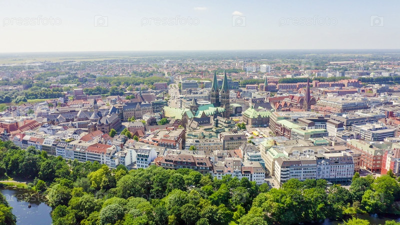 Бремен, Германия. Историческая часть Бремена, старый город. Бременский собор (Св. Петри, Бремен). Вид в полете, вид с воздуха