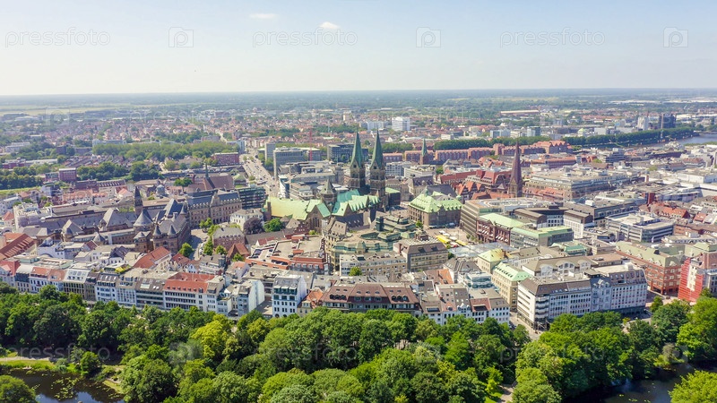 Бремен, Германия. Историческая часть Бремена, старый город. Бременский собор (Св. Петри, Бремен). Вид в полете, вид с воздуха