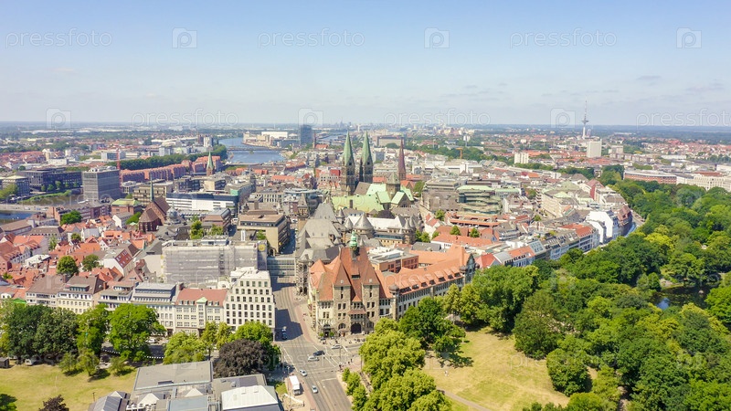 Бремен, Германия. Историческая часть Бремена, старый город. Бременский собор (Св. Петри, Бремен). Вид в полете, вид с воздуха