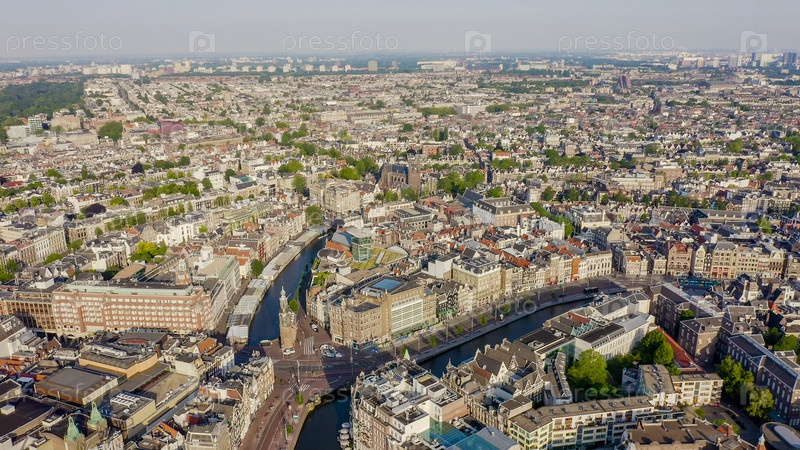 Амстердам, Нидерланды. Летать над крышами города. Историческая часть города с городскими судоходными каналами, вид с воздуха