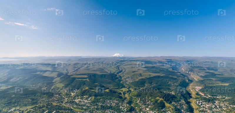Кисловодск, Россия. Панорама города и гор. С высоты птичьего полета. Вид на Эльбрус