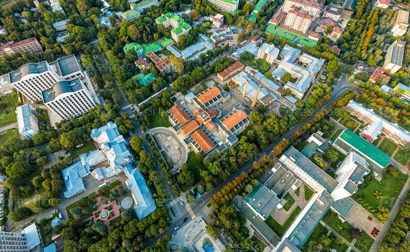 Ессентуки, Россия. Ессентукские бальнеогрязевые ванны. Самый известный архитектурный памятник курортного города. С высоты птичьего полета