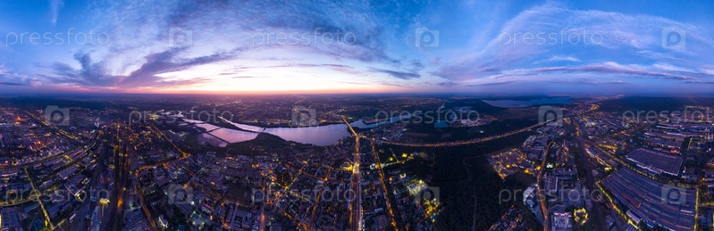Липецк, Россия. Металлургический завод. Левобережный район. Сияние после захода солнца. Лето. Панорама 360. Вид с воздуха