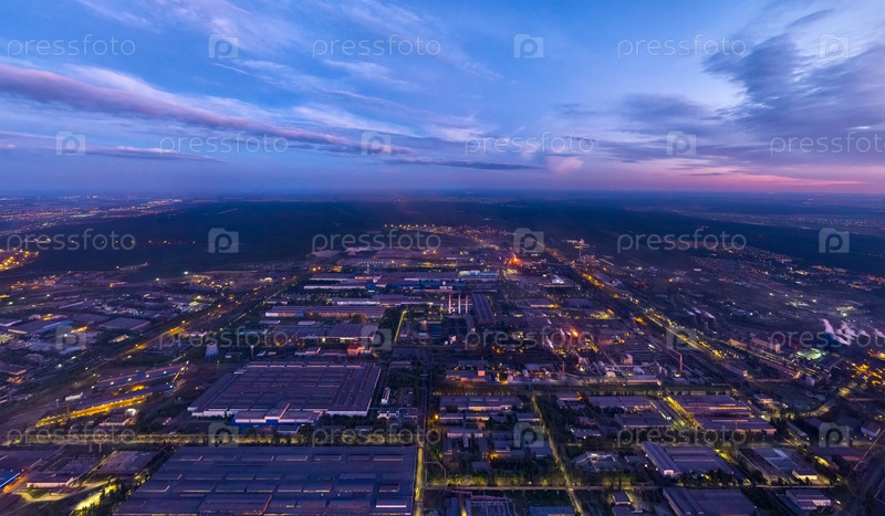 Липецк, Россия. Металлургический завод. Левобережный район. Сияние после захода солнца. Лето. С высоты птичьего полета