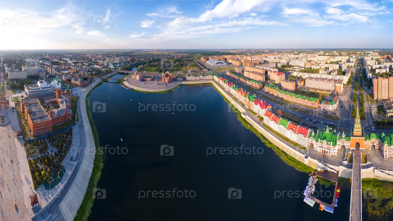 Йошкар-Ола, Россия. Панорама центра города во время заката. С высоты птичьего полета