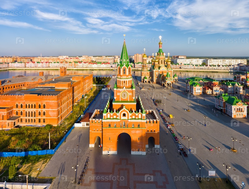 Йошкар-Ола, Россия. Благовещенская башня. Время заката. С высоты птичьего полета