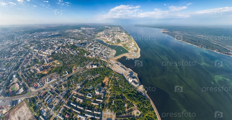 Чебоксары, Россия. Панорама города с воздуха. Чебоксарский залив. река Волга. Солнечный день. С высоты птичьего полета