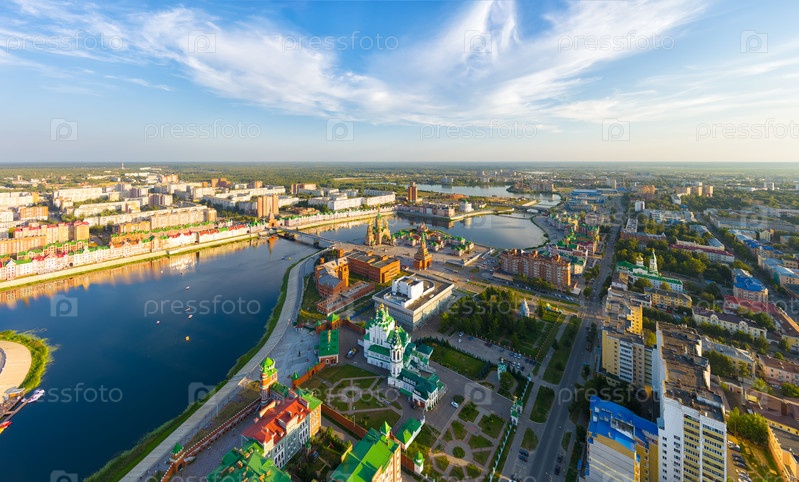 Йошкар-Ола, Россия. Панорама центра города во время заката. С высоты птичьего полета
