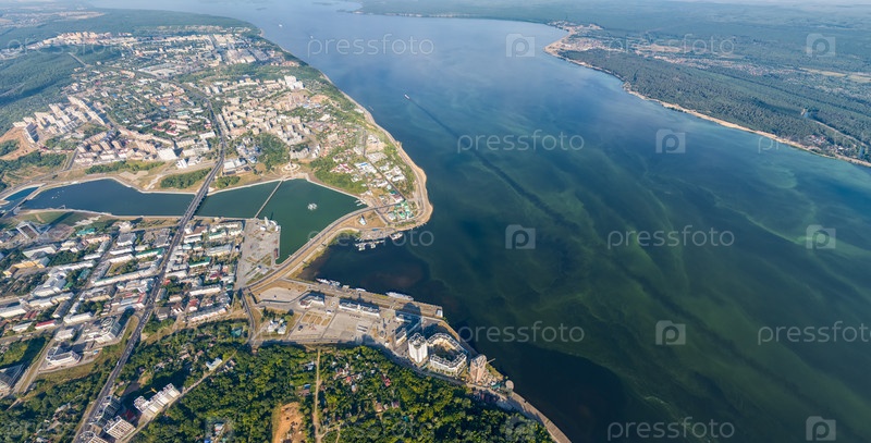 Чебоксары, Россия. Панорама города с воздуха. Чебоксарский залив. река Волга. Солнечный день. С высоты птичьего полета