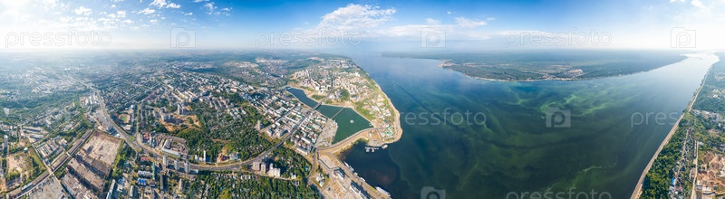 Чебоксары, Россия. Панорама города с воздуха. Чебоксарский залив. река Волга. Солнечный день. Панорама 360