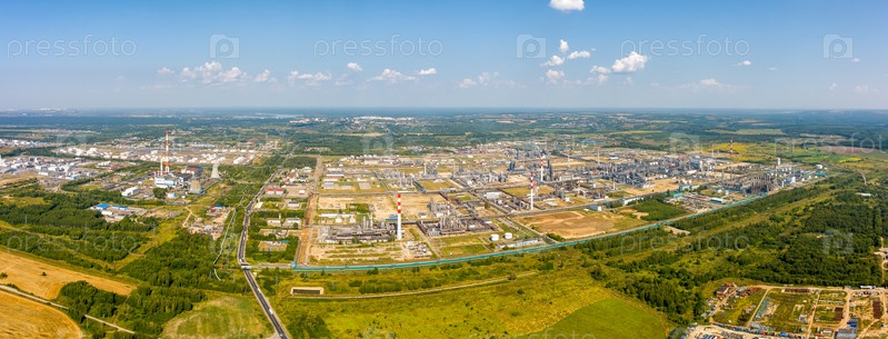 Кстово, Нижегородская область, Россия. Нефтеперерабатывающий завод на трассе М7 Волга. Южный обход Нижнего Новгорода. С высоты птичьего полета