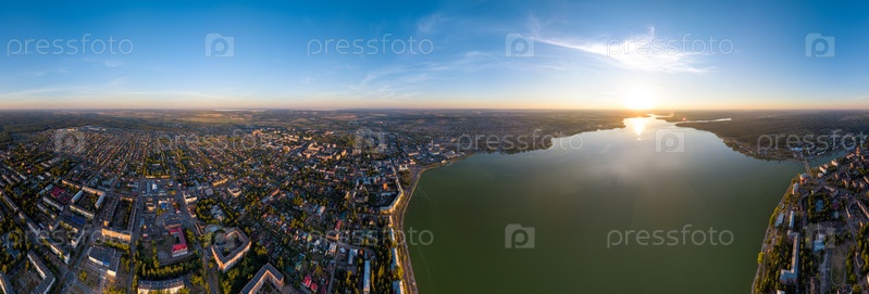 Воткинск, Россия. Панорама города. Воткинская плотина, 1758 г. Воткинский пруд и завод. Время заката. С высоты птичьего полета. Панорама 360
