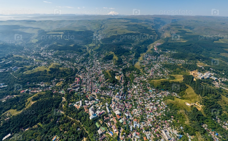 Кисловодск, Россия. Панорама города и гор. С высоты птичьего полета. Вид на Эльбрус