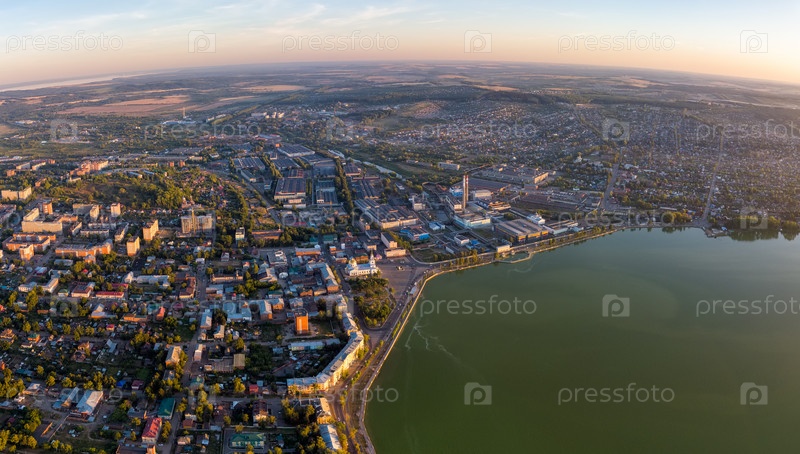 Воткинск, Россия. Воткинская плотина, 1758 г. Воткинский пруд и завод. Время заката. С высоты птичьего полета
