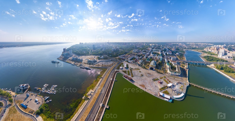 Чебоксары, Россия. Панорама города с воздуха. Чебоксарский залив. река Волга. Солнечный день. С высоты птичьего полета