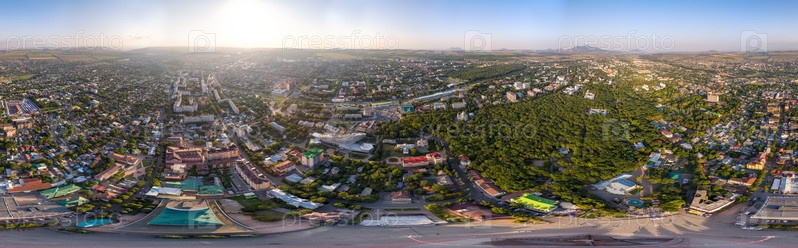Ессентуки, Россия. Курортный город. Панорамный вид на город на закате. С высоты птичьего полета. Панорама 360
