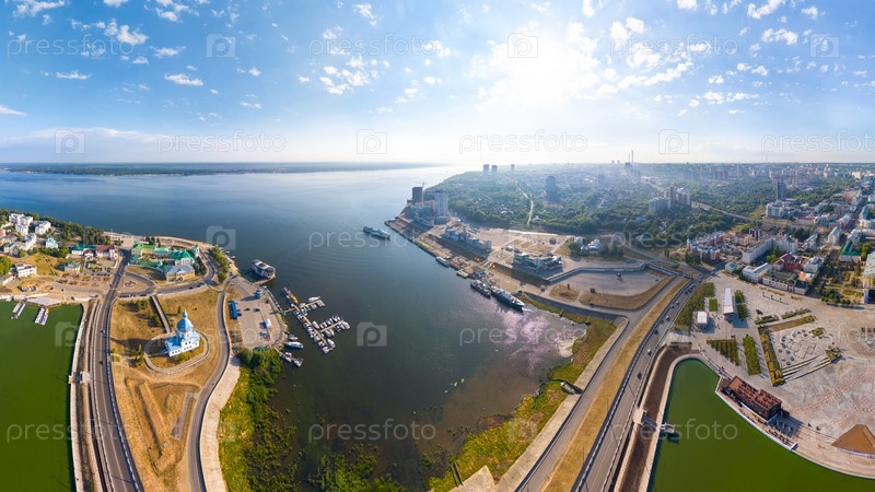 Чебоксары, Россия. Панорама города с воздуха. Чебоксарский залив. река Волга. Солнечный день. С высоты птичьего полета